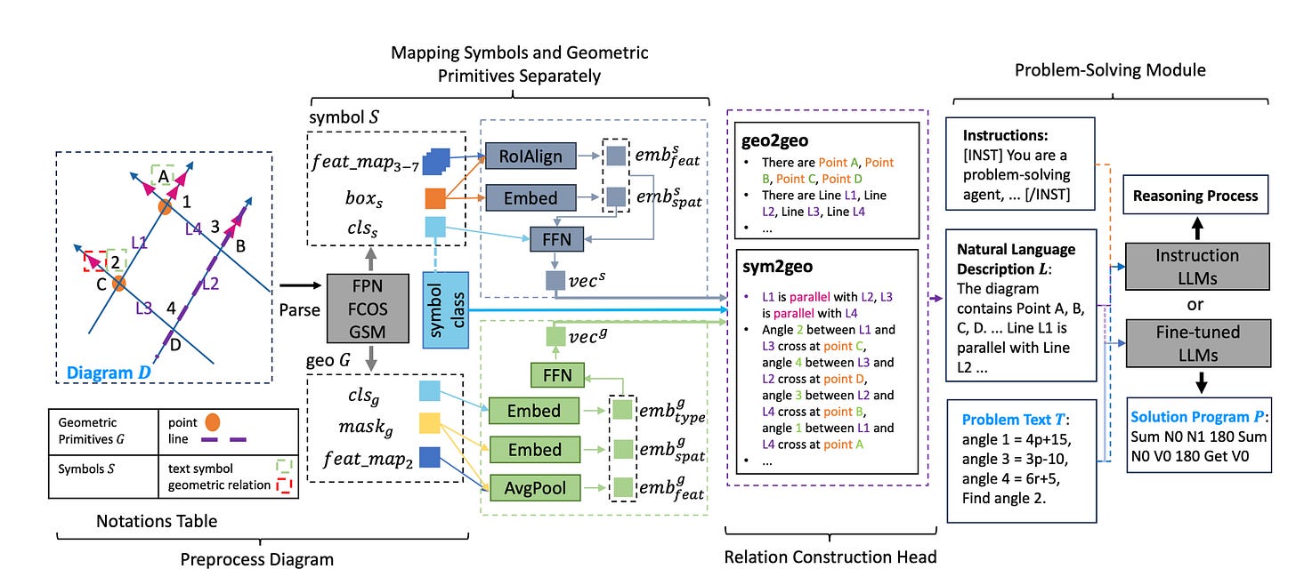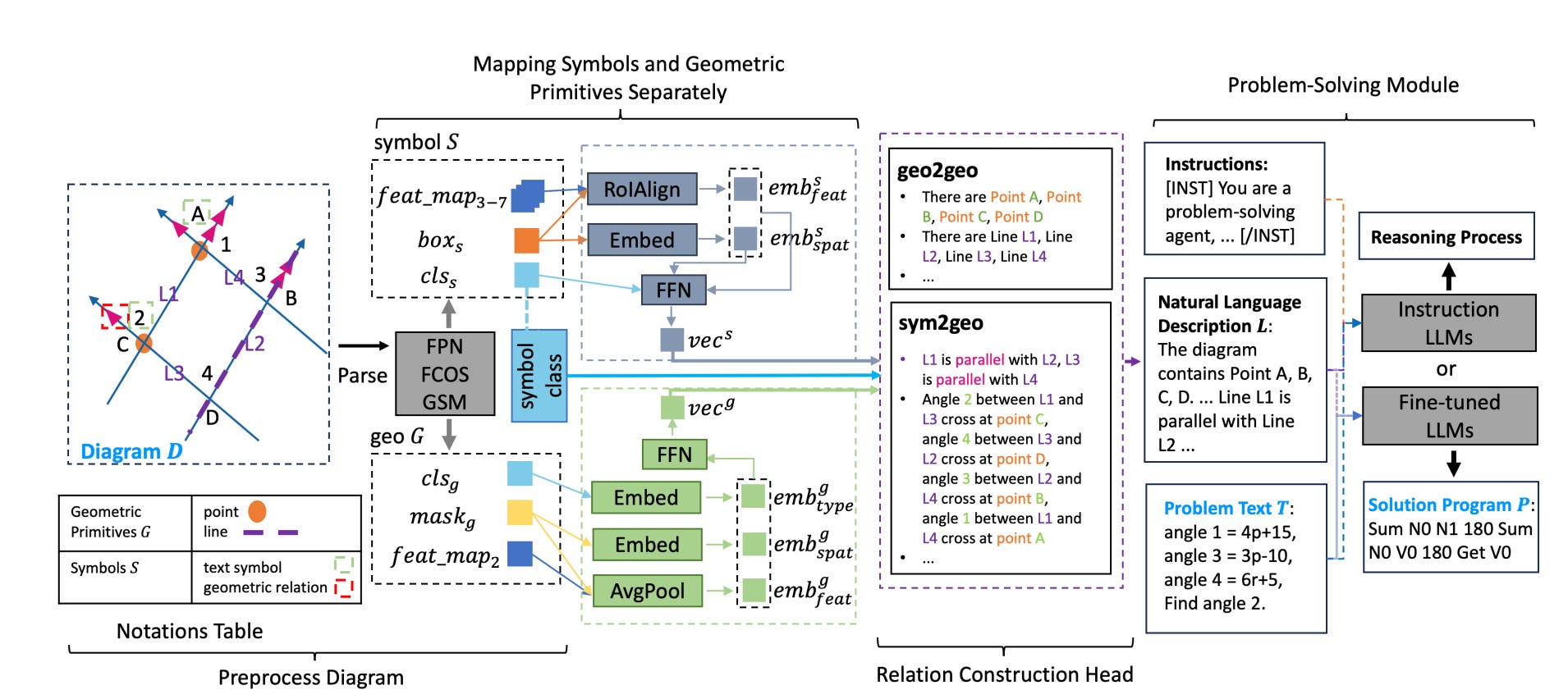 Alternatively, some researchers have translated geometry diagrams into formal languages to improve precision and interpretability. Nonetheless, these techniques do not differentiate between relationships among geometric shapes and those between symbols and shapes, complicating the problem-solving process. Additionally, these methods require specialized solvers that accept formal languages, which are not compatible with the more common large language models.