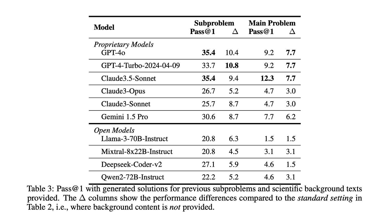 In the table below, the authors also present results when background text authored by scientists is provided to the LLMs and generated solutions to previous subproblems are used. This setting evaluates both the models’ capabilities to faithfully follow the instructions provided in the background as well as their code-generation performance. The ∆ columns indicate performance differences compared to the standard setup.