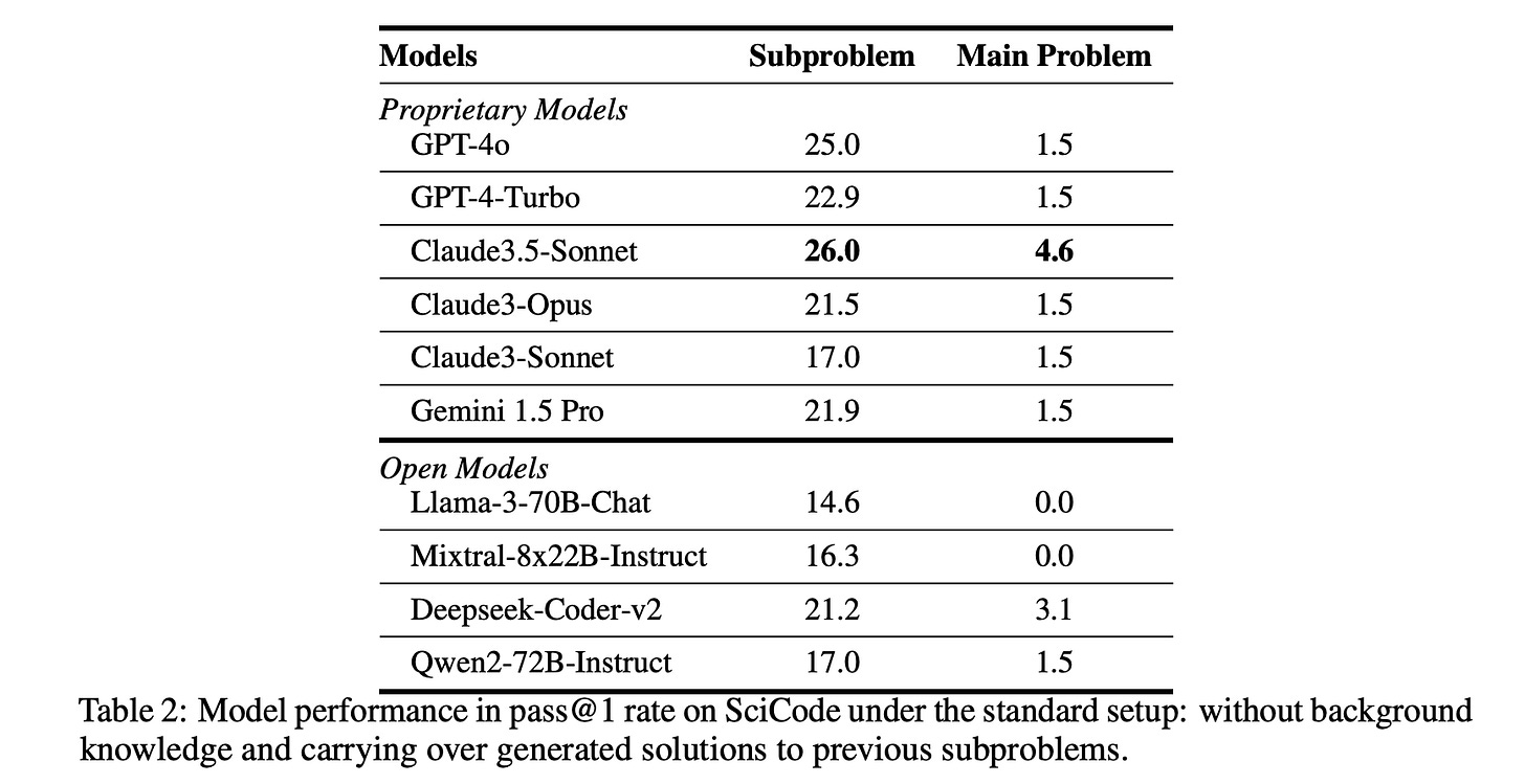The table below presents results under the standard setup. For the easier subproblem-level evaluation, the state-of-the-art models being tested solve 14%-26% of the subproblems. Among them, Claude3.5-Sonnet achieves the best performance, with a 26.0% pass@1 rate. However, all models perform much worse on the more realistic and challenging main problem evaluation. Claude3.5-Sonnet still performs the best in this setting, but with only a 4.6% pass@1 rate. The authors use these results to confirm that SciCode is a difficult benchmark for current LLMs. Consistent with their observations on proprietary models, open-weight LLMs under test also showed their lack of capabilities in solving any main problem despite being able to solve a number of sub-problems correctly.