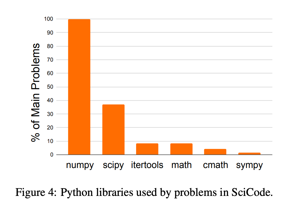 To facilitate evaluation of this new benchmark, the authors had “scientist annotators” use only widely adopted and well-documented packages such as NumPy, SciPy, and SymPy when writing the solution code for their problems, as shown in the figure below. Their test suite involves two key components. (1) Numerical tests list input-output pairs to check if the generated code produces the same outputs as ground truth. (2) Domain-specific test cases, introduced as an additional stage, evaluate whether model-generated solutions align with scientists’ practical needs and further ensure the correctness and applicability of each solution within its specific field. These tests are extracted from real scientific workflows: scientists must design domain-specific test cases to verify code accuracy by reproducing results published in academic papers or matching analytical solutions derived from theoretical models.