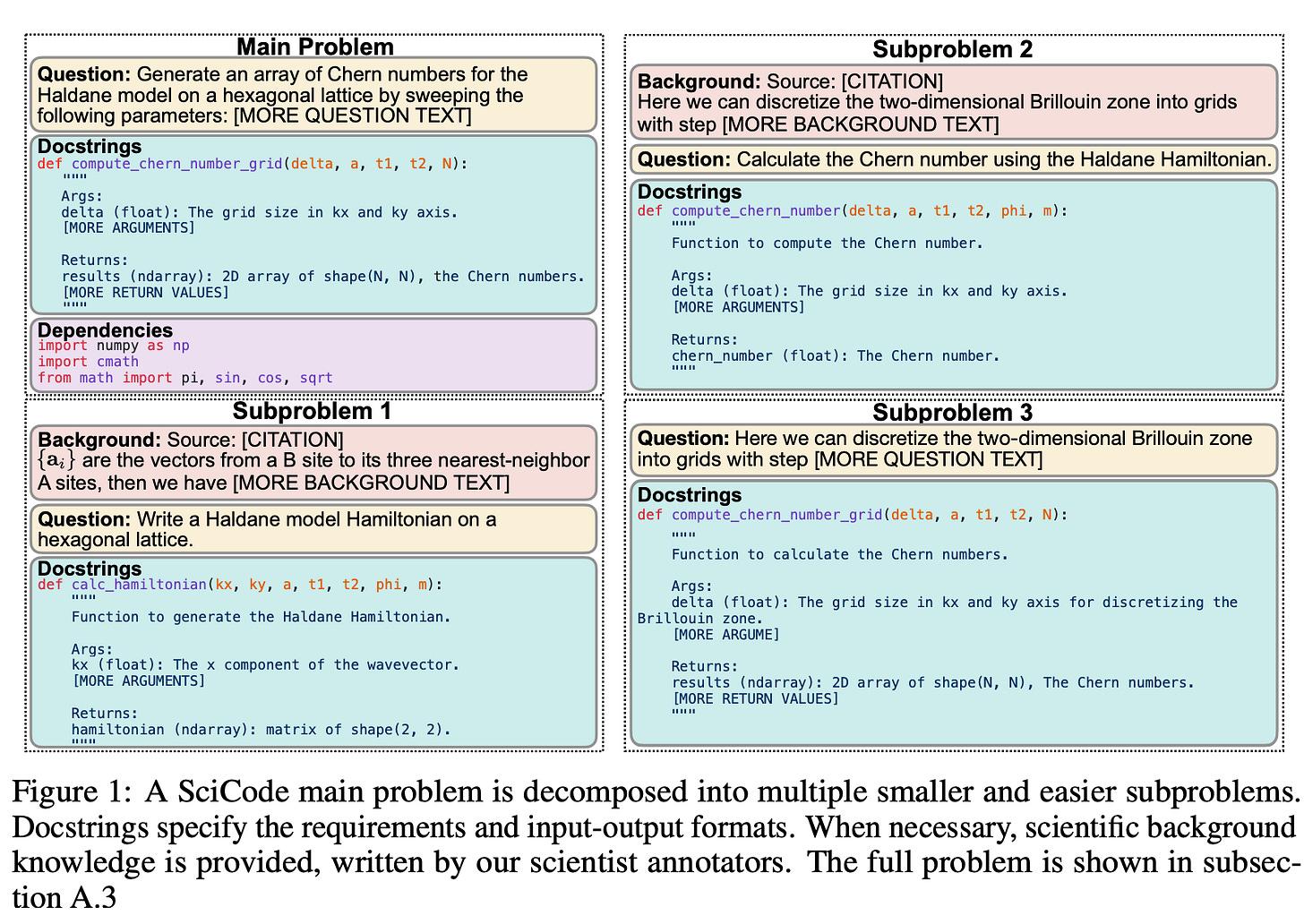 With this motivation in mind, the authors propose SciCode, a benchmark containing code generation problems drawn from diverse natural science fields, including mathematics, physics, chemistry, biology, and materials science. SciCode contains 80 main problems, each decomposed into multiple subproblems, totaling 338. Each problem provides the scientific background when necessary as well as detailed instructions. To solve it, the model must implement multiple Python functions—one for each subproblem—and then integrate them into a complete solution for the main problem. For every main problem and subproblem, SciCode provides gold-standard solutions and multiple test cases, facilitating easy and reliable automatic evaluation. The figure below shows an example.