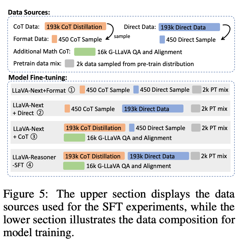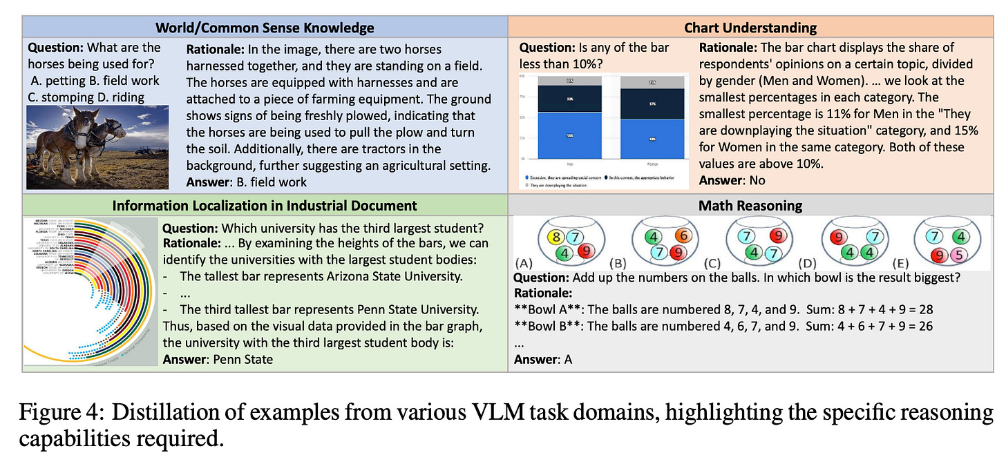 To mitigate the limited availability of high-quality CoT data, the authors leverage VQA datasets with short annotations and augment them with rationales generated by the GPT-4o model. They collect 193k visual CoT instances to create the SHAREGPT-4O-REASONING dataset, which they say that they plan to release for public use. Figure 4 demonstrates examples of distilled reasoning across various types of tasks, such as: