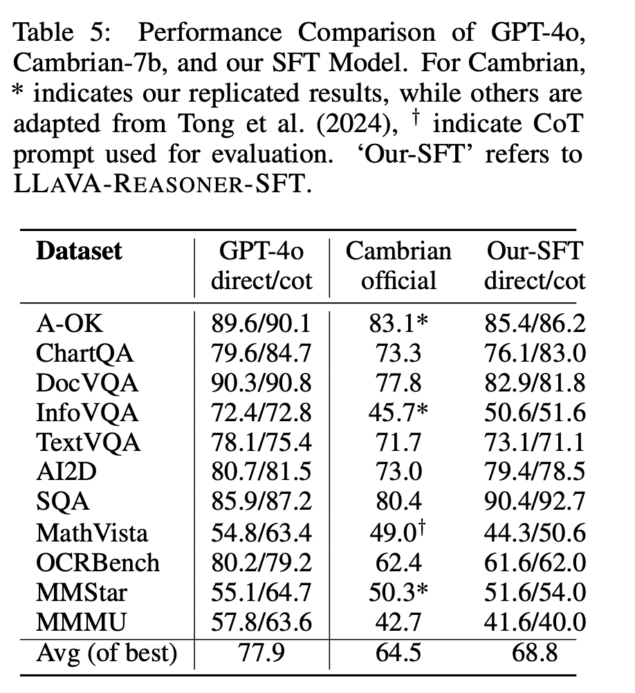 Does the new dataset work as expected to improve performance? Table 5 below compares the performance of the SFT model developed by the authors (referred to as LLaVA-Reasoner-SFT) with two other models: GPT-4o and Cambrian-7B.